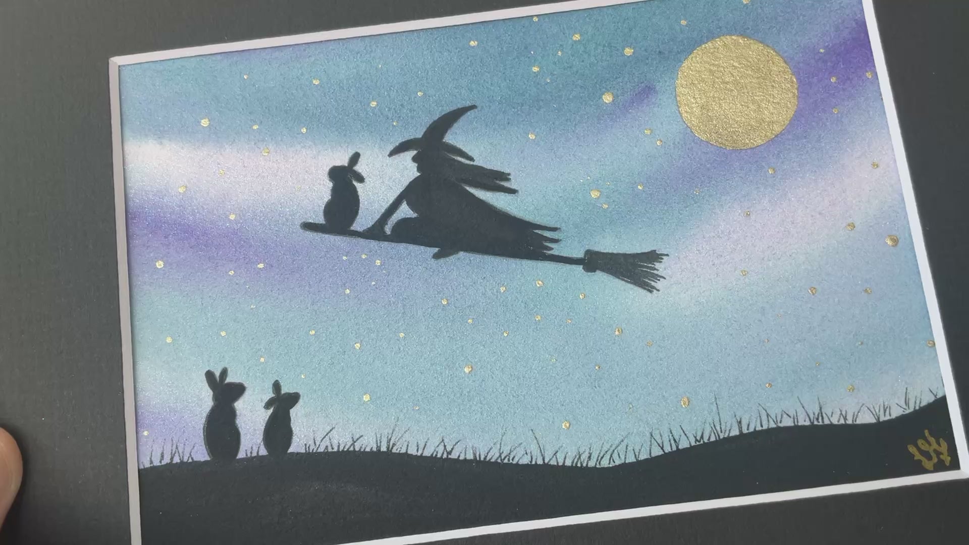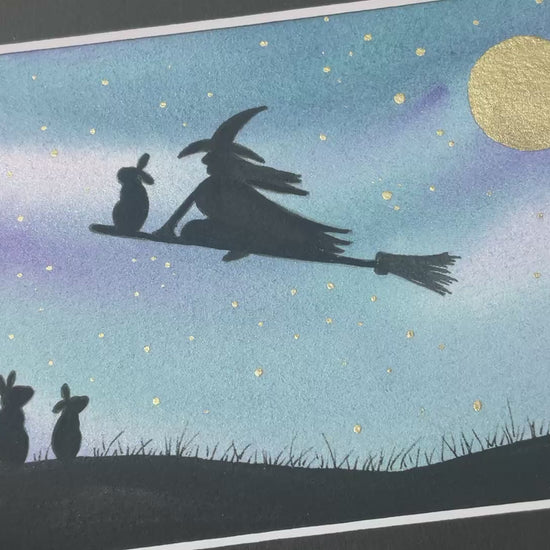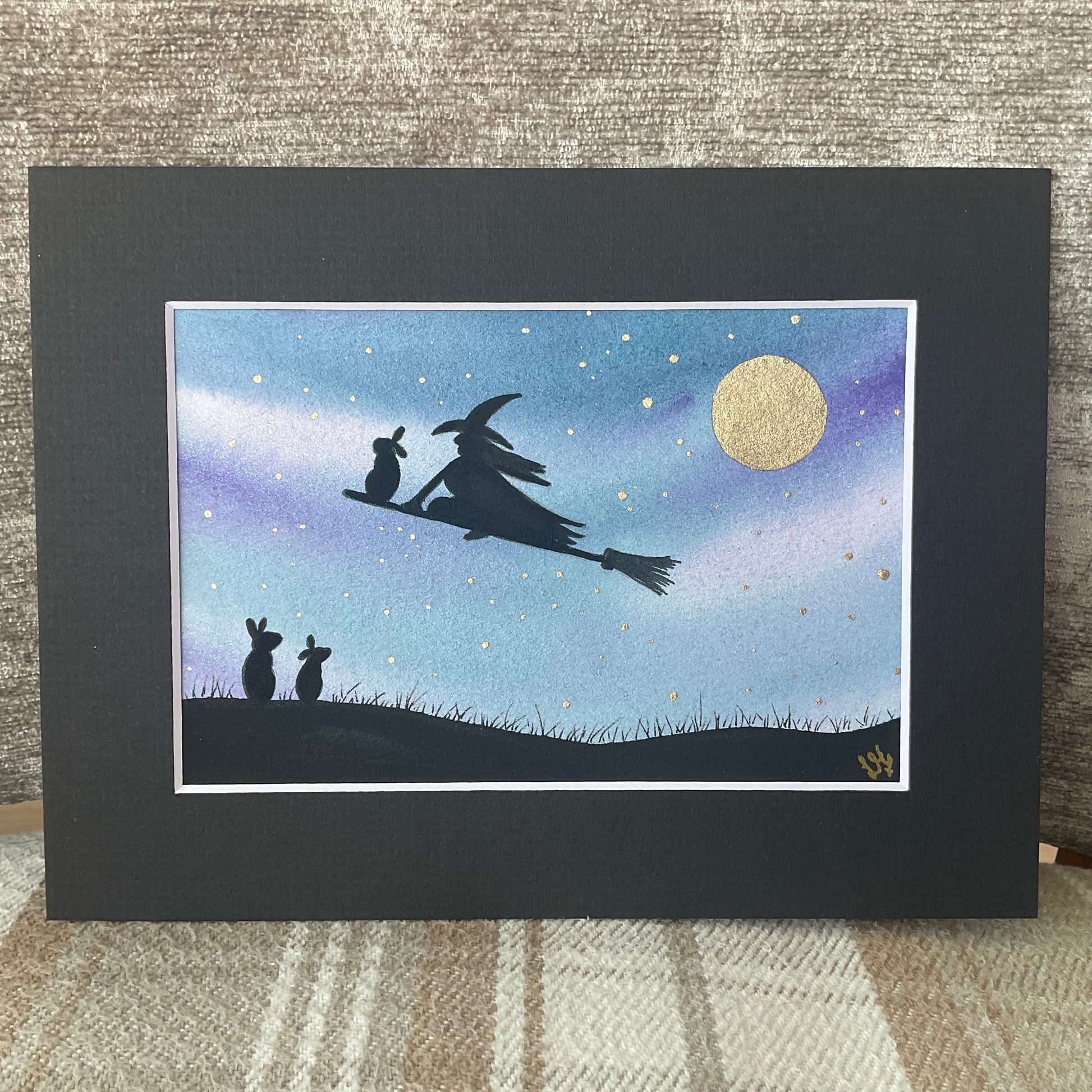 Capture the enchanting charm of "Hoppy Witch," an original 6” x 4” watercolour painting featuring a whimsical bunny taking a joyful broomstick ride under the night sky, while fellow bunnies watch in awe. Hand-painted with delicate details, this painting will add a touch of warmth and whimsy to any space. We also have a personalised version of this painting in another listing.